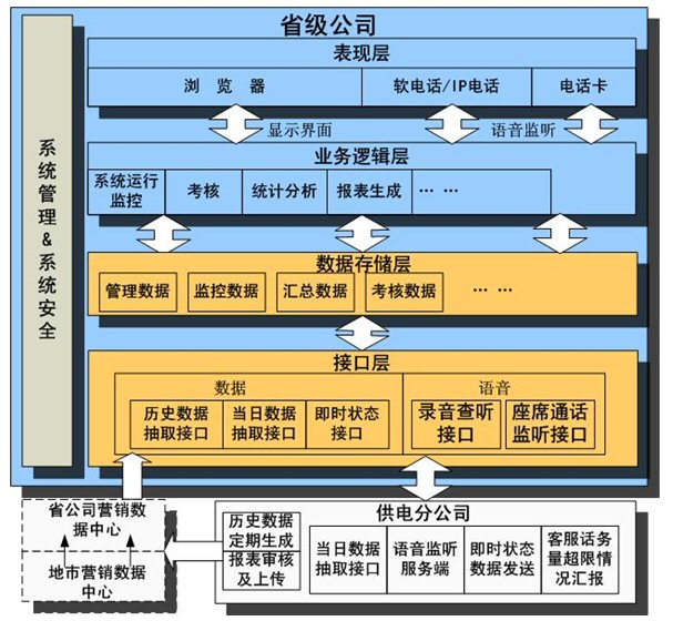 客服監(jiān)管系統(tǒng)中省級公司部分通過接口層與供電公司的客戶服務(wù)系統(tǒng)交換數(shù)據(jù)。通過業(yè)務(wù)邏輯層對接收到的數(shù)據(jù)進(jìn)行處理、展現(xiàn),并且處理要發(fā)送的數(shù)據(jù),在此實(shí)現(xiàn)所有的業(yè)務(wù)邏輯。供電公司部分負(fù)責(zé)提供歷史的和當(dāng)天的各種業(yè)務(wù)數(shù)據(jù)。整個結(jié)構(gòu)中也考慮到了數(shù)據(jù)中心,數(shù)據(jù)中心建立后將定期導(dǎo)入各供電公司客戶服務(wù)系統(tǒng)的歷史數(shù)據(jù),并提供給省級公司包括監(jiān)管系統(tǒng)在內(nèi)的各種應(yīng)用系統(tǒng)使用。