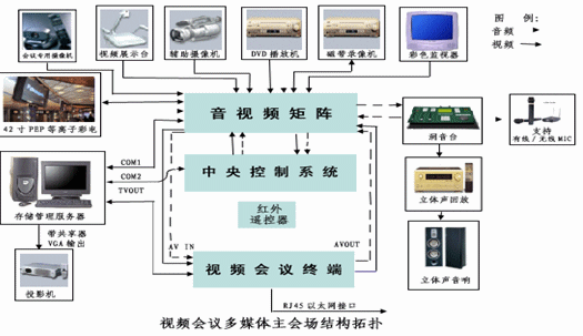 以上設(shè)備分別通過綜合信息網(wǎng)提供的100M快速交換以太網(wǎng)接入會(huì)議網(wǎng)系統(tǒng)。在控制室,我們配置一臺(tái)筆記本電腦,分別用來運(yùn)行會(huì)議管理系統(tǒng)、會(huì)議控制軟件,配置視頻會(huì)議系統(tǒng)會(huì)議存儲(chǔ)管理服務(wù)器對(duì)視頻會(huì)議網(wǎng)絡(luò)進(jìn)行統(tǒng)一監(jiān)控管理,會(huì)議存儲(chǔ)管理服務(wù)器用來存儲(chǔ)會(huì)議內(nèi)容供以后二次利用點(diǎn)播/廣播服務(wù)。他們均以100M快速交換以太網(wǎng)接入綜合網(wǎng)。在會(huì)議控制人員進(jìn)行管理時(shí),他們只需進(jìn)入控制軟件界面,輸入正確的口令后即可進(jìn)行會(huì)議管理和控制及會(huì)議設(shè)置和維護(hù),也可以通過配置的便攜式維護(hù)終端1套(筆記本電腦)進(jìn)行。見下圖: