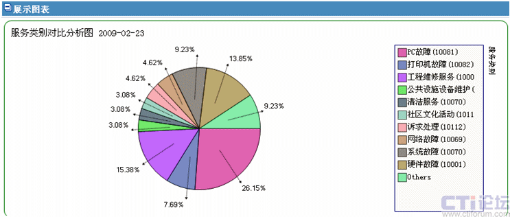 3. 服務(wù)類(lèi)比:系統(tǒng)自動(dòng)生成月度、年度的服務(wù)類(lèi)比。管理者通過(guò)服務(wù)類(lèi)比圖可以清晰的看到那項(xiàng)服務(wù)發(fā)生故障的可能性是最高的,對(duì)下一步管理提出了科學(xué)依據(jù);