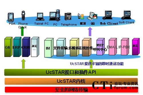UcSTAR企業(yè)融合通信是集IM、音頻、視頻、SMS、EMAIL、Web Live Contact(即在線客服)等各種通信手段于一體的融合通信平臺。它把這些通信手段有機(jī)地結(jié)合,并能夠擴(kuò)展集成券商部門的OA、ERP等多套管理系統(tǒng),為券商建立內(nèi)部的一體化交流平臺和對外的溝通渠道。