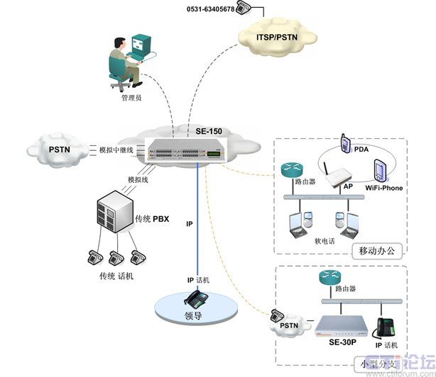 SE150還可以通過配置FXO、E1/T1等擴(kuò)展模塊,實(shí)現(xiàn)與PSTN或傳統(tǒng)PBX設(shè)備的互聯(lián),實(shí)現(xiàn)與傳統(tǒng)語音交換設(shè)備的互通。通過SE150的IP中繼方式,不但可以連接到本公司的其它IP PBX設(shè)備,還可以實(shí)現(xiàn)與運(yùn)營商的NGN平臺對接,實(shí)現(xiàn)基于IP網(wǎng)的互聯(lián)。