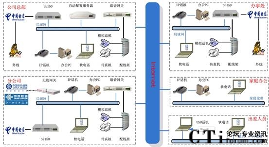 分布式部署:總部和各分支機(jī)構(gòu)的分機(jī),是通過IP網(wǎng)絡(luò)融合在一個(gè)語音平臺(tái)上來實(shí)現(xiàn)內(nèi)部通信。總部和辦事處分機(jī)、家庭辦公分機(jī)、出差人員的軟電話均注冊(cè)在總部的SE150上,各分公司的分機(jī)注冊(cè)在本地的SE150上,由本地的SE150管理。