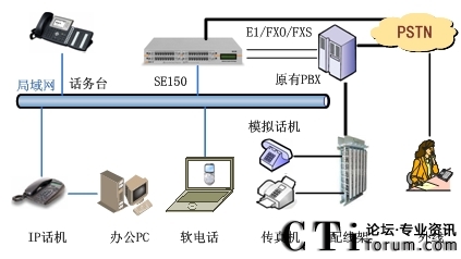 - 保護(hù)用戶投資:SE150或語音網(wǎng)關(guān)提供FXS、FXO、E1接口,可連接原有的PBX,把新部署的語音網(wǎng)絡(luò)和原有語音網(wǎng)絡(luò)融合在一起,實(shí)現(xiàn)內(nèi)部通信,有效保護(hù)用戶投資。