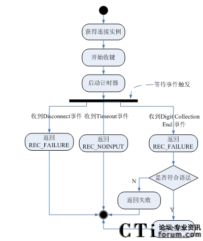 4)如果接收到SC_EVENT_DISCCONET事件,表示用戶主動(dòng)放棄,返回REC_FAILURE,調(diào)用EndSession,流程結(jié)束;如果接收到SC_EVENT_TIMEOUT事件,表示用戶在計(jì)時(shí)器的時(shí)間內(nèi)沒有輸入,返回REC_NOINPUT,調(diào)用EndSession,流程結(jié)束;如果接收到SC_EVENT_DTMF_RECEIVED事件,表示用戶輸入完畢,進(jìn)入下一步;