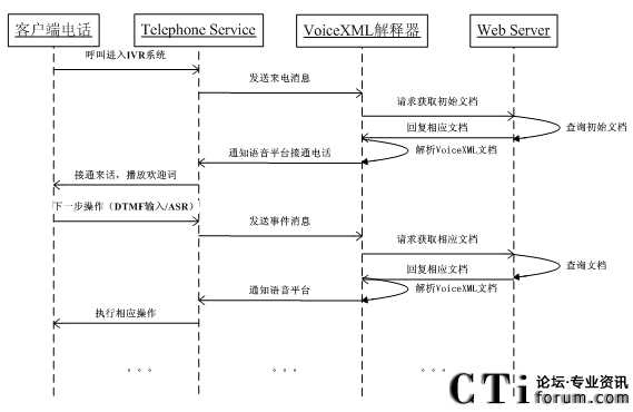 而IVR系統(tǒng)執(zhí)行引擎是根據(jù)IVR系統(tǒng)的特點(diǎn),基于VoiceXML技術(shù)的設(shè)計(jì)所實(shí)現(xiàn)的流程解釋器,主要針對(duì)解釋執(zhí)行通過(guò)IVR系統(tǒng)流程定義工具所設(shè)計(jì)的中間文件,并控制硬件交換機(jī)及板卡按照工作流程的內(nèi)容完成相應(yīng)的功能。