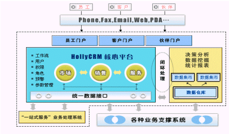HOLLYCRM系統(tǒng)包括七大部分:HOLLYCRM核心平臺、HOLLYCRM門戶、HOLLYCRM市場營銷管理分系統(tǒng)、HOLLYCRM銷售管理分系統(tǒng)、HOLLYCRM服務(wù)管理分系統(tǒng)、HOLLYCRM決策支持系統(tǒng)和"一站式服務(wù)"業(yè)務(wù)處理系統(tǒng)。其中"一站式服務(wù)"業(yè)務(wù)處理系統(tǒng)是專門為電信行業(yè)開發(fā)的后臺系統(tǒng),與前臺系統(tǒng)緊密集成。