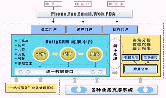 更關(guān)鍵是,HOLLYCRM(合力金橋軟件)的CRM不是單純的、簡單的客戶管理產(chǎn)品,它是一套完整的解決方案,覆蓋了協(xié)作型、運營型和分析型的全部范疇,其結(jié)構(gòu)框架見圖,其核心平臺涉及到市場、銷售、服務(wù)等多個環(huán)節(jié),并通過數(shù)據(jù)集市或者數(shù)據(jù)倉庫的形式,提供數(shù)據(jù)挖掘、決策分析等服務(wù)。最關(guān)鍵的是,HOLLYCRM(合力金橋軟件)在提供解決方案外,還不斷提升管理和咨詢能力,和一些咨詢公司合作,將咨詢和產(chǎn)品作為一個整合的方案提供給用戶,并提供360度的系統(tǒng)咨詢、設(shè)計和實施、維護(hù)服務(wù)。