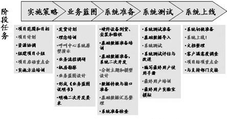 根據(jù)產(chǎn)品選型的結(jié)果和選定的系統(tǒng)集成商,由甲乙雙方人員組成項(xiàng)目組,對(duì)項(xiàng)目進(jìn)行實(shí)施。此階段最容易出現(xiàn)各種問題,如果處理不好,很可能導(dǎo)致呼叫中心的建設(shè)失敗。這個(gè)環(huán)節(jié)很重要的一點(diǎn)就是系統(tǒng)集成商是否有成熟的實(shí)施方法論來指導(dǎo)項(xiàng)目的實(shí)施,降低項(xiàng)目實(shí)施中的風(fēng)險(xiǎn),確保項(xiàng)目能順利實(shí)施。圖4是HOLLYCRM公司項(xiàng)目實(shí)施方法論的一個(gè)概貌,可供大家參考。