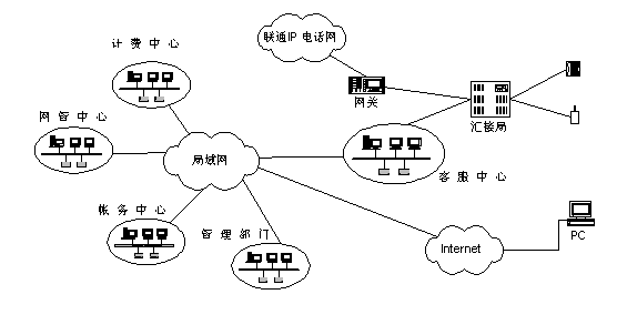 聯(lián)通北京分公司將客戶服務(wù)系統(tǒng)與現(xiàn)有計費(fèi)、營業(yè)、帳務(wù)系統(tǒng)進(jìn)行組織,形成了一個有機(jī)的結(jié)合體,能夠充分發(fā)揮出現(xiàn)有系統(tǒng)的優(yōu)勢。客戶服務(wù)系統(tǒng)從營業(yè)帳務(wù)系統(tǒng)提取相關(guān)用戶資料,建立客戶服務(wù)的系統(tǒng)資料庫,從計費(fèi)系統(tǒng)提取相關(guān)用戶話費(fèi)資料等供查詢使用。同時客服系統(tǒng)還將與北京聯(lián)通現(xiàn)有的計費(fèi)、營業(yè)、帳務(wù)、網(wǎng)管等相關(guān)系統(tǒng)以及Internet相連,提供業(yè)務(wù)處理和用戶自助服務(wù)等業(yè)務(wù)。本客服中心通過2對路由器和DDN專線與聯(lián)通北京分公司現(xiàn)有的局域網(wǎng)(包括管理部門、網(wǎng)管中心、計費(fèi)中心、帳務(wù)中心等相關(guān)系統(tǒng))連接,并通過該局域網(wǎng)訪問Internet。