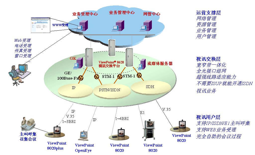 “視點(diǎn)通”ViewPoint®8000綜合視訊系統(tǒng)可以充分利用現(xiàn)有網(wǎng)絡(luò)資源,為網(wǎng)絡(luò)運(yùn)營商提供完善的訊業(yè)務(wù)運(yùn)營解決方案,使得視訊業(yè)務(wù)真正能夠廣泛服務(wù)于遠(yuǎn)程教學(xué)、企業(yè)會(huì)商、遠(yuǎn)程醫(yī)療、應(yīng)急通信、行政會(huì)議等領(lǐng)域,并逐步進(jìn)入千家萬戶。