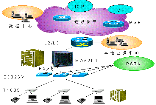 另外,Quidway S3026V可與華為公司MA5200等組網(wǎng),通過(guò)HGMP(Huawei Group Management Protocal)華為組管理協(xié)議,S3026V與華為MA5200、S3526等上行管理設(shè)備共同提供寬帶接入網(wǎng)的整網(wǎng)解決方案,實(shí)現(xiàn)對(duì)Quidway(R) S3026V的集中管理,為用戶提供更廣泛、更豐富的業(yè)務(wù)功能,充分體現(xiàn)華為公司在寬帶網(wǎng)絡(luò)上具有的“可運(yùn)營(yíng)、可管理、可維護(hù)”優(yōu)勢(shì)。 如圖2所示: