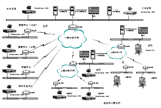 為進(jìn)一步強(qiáng)化企業(yè)內(nèi)部的集約化管理,中國工商銀行決定部署IP視頻會議網(wǎng)。要求該系統(tǒng)基于寬帶通信網(wǎng)絡(luò),建立起工行總行與下屬各單位間的視頻聯(lián)系,提供語音、圖像和演示的交互,從而實現(xiàn)二級分行以上的視頻會議系統(tǒng)。同時,總行通過視頻會議可以加強(qiáng)對下屬單位的有效控制和業(yè)務(wù)管理、實現(xiàn)高效辦公、減少會議開支,而且通過多媒體交互技術(shù),實現(xiàn)直觀、可靠、便捷的會議效果,為今后逐步實現(xiàn)工行扁平化管理提供安全、便利和快捷的技術(shù)基礎(chǔ)。另一方面,各分會場可以通過該系統(tǒng)提高工作效率,進(jìn)行交互式的技術(shù)培訓(xùn)、技術(shù)方案探討等工作。