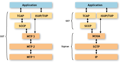 MTP3 或 SIGTRAN (M3UA/SCTP)進行傳輸。