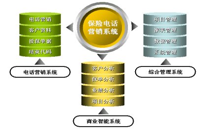 保險(xiǎn)電話營銷系統(tǒng)從功能上分為電話營銷、綜合管理以及商業(yè)智能三大子系統(tǒng)。其功能結(jié)構(gòu)圖如下: