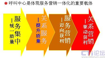 呼叫中心是體現服務營銷一體化的重要載體。我在前面已經說了,服務和營銷一個是被動一個是主動,一個inbound一個outbound,呼叫中心可以非常完整地將兩者融合到一起,它是一個非常重要的服務營銷的載體。我們從呼叫中心整個營銷策略的進程當中,可以看到非常明顯的四個階段: