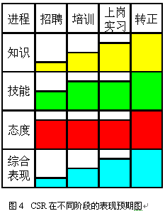 即使經(jīng)過規(guī)范的上崗培訓(xùn)與考核,新員工通常也只達(dá)到老員工70%左右的表現(xiàn)。因此制定明確的實(shí)習(xí)期,在實(shí)習(xí)期間加強(qiáng)指導(dǎo)和培養(yǎng)是非常重要的。通常經(jīng)過3個(gè)月的實(shí)習(xí),新員工已經(jīng)可以達(dá)到一個(gè)標(biāo)準(zhǔn),這時(shí)便可以轉(zhuǎn)正了。圖3和圖4表現(xiàn)了不同階段對(duì)CSR的不同預(yù)期,以及不同階段的主要工作。
