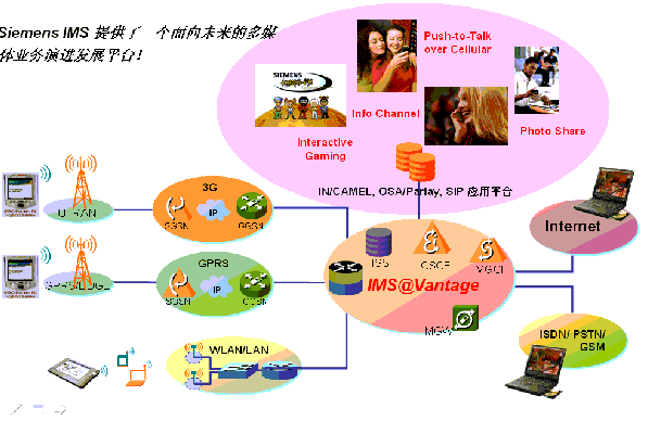 由于IMS與接入無關(guān)的技術(shù)特點,IMS@vantage支持各種接入方式,如無線接入中的WLAN、GPRS、WCDMA/TD-SCDMA等,這些無線資源都能作為用戶接入技術(shù)與IMS系統(tǒng)連接。此外,西門子目前也實現(xiàn)了在固定接入方式下的多種應(yīng)用。