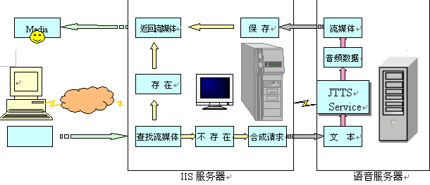 語(yǔ)音服務(wù)器方案是指利用捷通華聲在CTI領(lǐng)域成熟應(yīng)用的jTTS Service語(yǔ)音服務(wù)器,增加一臺(tái)或多臺(tái)語(yǔ)音服務(wù)器到現(xiàn)有的IIS服務(wù)系統(tǒng)的網(wǎng)絡(luò)環(huán)境中;在IIS服務(wù)器中,增加訪問(wèn)語(yǔ)音服務(wù)器的功能。當(dāng)IIS服務(wù)器需要流媒體輸出時(shí),向語(yǔ)音服務(wù)器發(fā)出請(qǐng)求,語(yǔ)音服務(wù)器接受IIS服務(wù)器的請(qǐng)求,并對(duì)請(qǐng)求的數(shù)據(jù)進(jìn)行合成、格式轉(zhuǎn)換,得到流媒體后返回給IIS服務(wù)器,IIS服務(wù)器再將此流媒體傳輸給用戶。