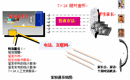 捷通華聲從關(guān)愛青少年成長出發(fā),提出了應(yīng)用于教育領(lǐng)域溝通平臺"家校通"系統(tǒng)的語音服務(wù)解決方案。家校通系統(tǒng)是一個融合了語音合成、計(jì)算機(jī)網(wǎng)絡(luò)集成綜合服務(wù)、互聯(lián)網(wǎng)、數(shù)據(jù)庫等多種先進(jìn)IT技術(shù)為一體的新一代家校聯(lián)系工具。它充分利用互聯(lián)網(wǎng)與目前最為普及的公眾電話等資源,為學(xué)校提供多樣化的信息發(fā)布渠道,同時強(qiáng)大的7×24小時的留言發(fā)布和查聽服務(wù)功能,為老師和家長提供一種全新、高效、便捷的交流方式,大大提高了家長的滿意度,提升了學(xué)校的管理實(shí)力。