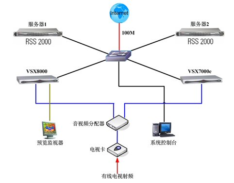 應(yīng)急備份:此系統(tǒng)中服務(wù)器1和服務(wù)器2互為備份;VSX8000和VSX7000e互為備份。RSS2000分配公網(wǎng)IP以便用戶通過互聯(lián)網(wǎng)接收直播和點(diǎn)播,兩臺(tái)服務(wù)器的地址同時(shí)發(fā)布在網(wǎng)站上。