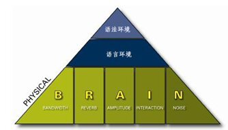 要達(dá)到清晰易懂的談話效果需要五個(gè)要素的配合:帶寬(Bandwidth)、回響(Reverberation)、振幅(Amplitude)、交互性(Interaction)、噪音水平(Noise)。任何一個(gè)會(huì)議系統(tǒng)的職責(zé)就是自動(dòng)調(diào)節(jié)和平衡這五個(gè)要素,使進(jìn)行交談的雙方都盡可能獲得最佳的聽覺享受。在英文里,我們可以用每個(gè)單詞的首字母來記憶這五個(gè)特征,即:BRAIN模型。