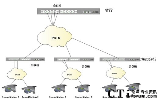 根據(jù)客戶(hù)需要在降低會(huì)議成本的前提下實(shí)現(xiàn)快速、便捷、實(shí)時(shí)的多點(diǎn)之間多人會(huì)議溝通的需求,我們制定了以下解決方案;系統(tǒng)利用傳統(tǒng)電話(huà)網(wǎng)絡(luò),是客戶(hù)擁有自己的會(huì)議管理系統(tǒng);省行方面使用Polycom SS2基本型商務(wù)會(huì)議電話(huà)或普通模擬電話(huà);各個(gè)市/縣級(jí)分行,根據(jù)自己會(huì)場(chǎng)的情況自選設(shè)備;