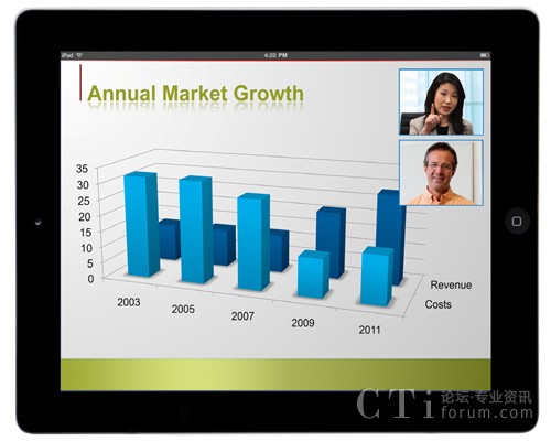 現(xiàn)在,在視頻通信需求增長、勞動力越來越偏遠以及技術進步的推動下,移動視頻會議正在顯著增長。今天的企業(yè)往往在地域上越來越分散,越來越虛擬,全球遠程辦公人員已超過10億。同時,技術的進步也推動了視頻移動社會,包括配有攝像頭的移動平板電腦和智能手機的普及;3G、4G和Wi-Fi網絡的出現(xiàn);以及云服務。事實上,Gartner仍然看好多媒體平板電腦市場帶來的機會,據他們預測到2015年平板電腦將售出3.2億部,到年底,累計銷售將超過9億部。到2015年,采用視頻聊天的人數(shù)預計將增長14倍,超過1.4億人。