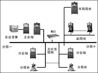 在每個(gè)分局和信息中心機(jī)房設(shè)置分會(huì)場(chǎng),實(shí)現(xiàn)網(wǎng)絡(luò)視頻會(huì)議和遠(yuǎn)程技術(shù)支持。分會(huì)場(chǎng)的會(huì)議終端設(shè)備選用VCON的會(huì)議室型柜式終端MediaConnect