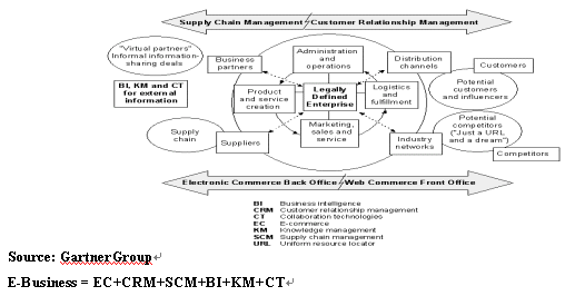 在 GartnerGroup 的一個名為“如何制定一個可操作的、有效的電子商務(wù)戰(zhàn)略”的報告中描述了電子商務(wù)(E-Business)的所有基本要素,他們是商業(yè)智能(BI),客戶關(guān)系管理(CRM),供應(yīng)鏈管理(SCM),知識管理(KM), 協(xié)同技術(shù)(CT) 和E-Commerce。這些要素將成為新的一輪電子商務(wù)浪潮的特征。一些公司如 Dell, IBM,已經(jīng)成為這一輪變革中成功的代表。