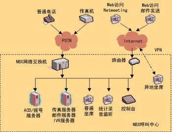 NBX網(wǎng)絡呼叫中心的核心是3Com公司的NBX網(wǎng)絡電話交換機,它具有PBX的功能,支持多種外線接入方式,呼入的語音信號轉(zhuǎn)換為數(shù)據(jù)包,在局域網(wǎng)內(nèi)部傳輸,實現(xiàn)局域網(wǎng)內(nèi)部語音、數(shù)據(jù)的統(tǒng)一。坐席可以延伸到數(shù)據(jù)網(wǎng)可以達到的地方(適當?shù)膸挘,而不受地理位置的限制。你可以通過申請各類專線,如VPN、DDN等,將計算機連入呼叫中心,實現(xiàn)分地域、分種類、分數(shù)據(jù)的服務。NBX網(wǎng)絡呼叫中心擴大了對外服務方式,通過上網(wǎng)訪問企業(yè)主頁,并使用Windows集成的Netmeeting軟件通過使用電腦的聲卡、耳機、麥克風直接與服務代理人員進行語音交流。