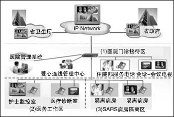 在安裝過程中,醫(yī)院通過原有的網(wǎng)絡(luò)系統(tǒng)就可完成視頻系統(tǒng)的搭建,該系統(tǒng)可應(yīng)用于隔離區(qū)、護士監(jiān)控室、會議室、醫(yī)療診斷室、住院部等地方。每個房間只要安裝一臺DVC-1000,同時配備電視機或投影機等視音頻播放設(shè)備,通過上面所述的安裝程序,就可以搭建一套互動式的視頻系統(tǒng),這樣醫(yī)護人員只要在監(jiān)控室就可以隨時觀察隔離區(qū)的病人(如圖2所示)。
