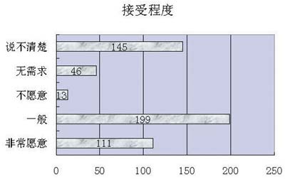 在調(diào)查中,67.4%的用戶對現(xiàn)有中國電信的資費標準(10元/分鐘)表示不滿,32.6%的用戶表示滿意。但同時58%的用戶對能接受的資費標準上又選擇了居中和較高的資費標準,表明用戶對視訊應(yīng)用產(chǎn)品的價格承受能力較高。
