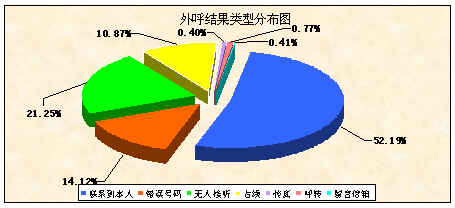 客戶呼叫響應(yīng)識別率是指系統(tǒng)應(yīng)能充分識別客戶的呼叫響應(yīng)(忙音、振鈴、傳真機(jī)、自動應(yīng)答機(jī)、留言信箱等),只有是在監(jiān)測到人聲的時候才把電話派給坐席代表進(jìn)行處理。識別率的高低將直接影響到整個項目的運(yùn)營質(zhì)量。有些廠商會告訴你,系統(tǒng)的識別率高于90%或95%,值得注意的是,我們需要確認(rèn)這個識別率到底是針對全部呼叫結(jié)果的還是只針對某些呼叫結(jié)果的(例如傳真機(jī)、自動留言機(jī)等)。傳統(tǒng)對呼叫結(jié)果的識別是根據(jù)對方電話的不同信令回路做出判斷的,但現(xiàn)在隨著“彩鈴”、傳真復(fù)印一體機(jī)、真人錄音的語音提示的廣泛應(yīng)用,傳統(tǒng)的識別技術(shù)已經(jīng)受到了嚴(yán)重挑戰(zhàn),對響應(yīng)識別率的要求也越來越高了。