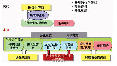 軟交換已經(jīng)從一種單純的技術(shù)發(fā)展成為網(wǎng)絡(luò)演進中的一種理念,這種理念的一個核心就是更加開放。而傳統(tǒng)運營商由垂直化的網(wǎng)絡(luò)、業(yè)務(wù)一體化對用戶“絕對控制”狀態(tài)走向開放化、平臺化管理的多業(yè)務(wù)單元共同參與的價值鏈最終方向,的確需要長期的過程。并且,這種發(fā)展過程的決定因素將不取決于技術(shù)發(fā)展的成熟與否,而是鏈條中各成員的生存狀態(tài)與利益分配。正如文中提到的,隨著網(wǎng)絡(luò)和應(yīng)用的不斷發(fā)展,業(yè)務(wù)與網(wǎng)絡(luò)的關(guān)系、運營商和業(yè)務(wù)經(jīng)營者的角色都將發(fā)生改變。
