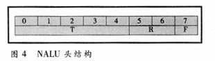 。危粒毯鸵酝鶚(biāo)準(zhǔn)不同,在 H.264中設(shè)置NAL層,把一個(gè)數(shù)據(jù)包(采用RTP/RTCP規(guī)程)放在一個(gè)NAL單元中,它的句法結(jié)構(gòu)可適用于各種不同網(wǎng)絡(luò),它的頭信息結(jié)構(gòu)見圖4,全長8 bit,其中T為類型,長5 bit,包括32個(gè)不同類型的NAL單元;R為2 bit,指示該NAL單元的重要性,分四個(gè)等級,用于不同的誤碼保護(hù);F為1 bit,指示該單元是否有誤碼(正常為0,誤碼為1)?梢姡危粒痰木浞ńY(jié)構(gòu)充分考慮到不同網(wǎng)絡(luò)環(huán)境下的誤碼保護(hù)。