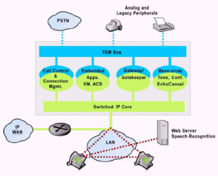 IP Enabled類IP-PBX的核心交換還是基于64K的傳統(tǒng)TDM交換網(wǎng)絡(luò),由一條傳統(tǒng)TDM BUS進(jìn)行控制,IP業(yè)務(wù)的支持需外接網(wǎng)關(guān)(可為內(nèi)置插板或外置模塊),其優(yōu)點(diǎn)與傳統(tǒng)TDM PBX完全相同,缺點(diǎn)是由于核心交換帶寬的限制,無法實(shí)現(xiàn)與寬帶數(shù)據(jù)網(wǎng)絡(luò)的無縫集成,IP業(yè)務(wù)支持有限,一般僅為IP Networking和一些簡(jiǎn)單IP桌面設(shè)備,而且網(wǎng)絡(luò)的透明度和IP桌面設(shè)備的功能都不太盡如人意。