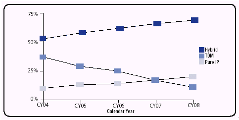 下圖是北美著名的市場(chǎng)分析和預(yù)測(cè)機(jī)構(gòu)Infonetics Research對(duì)以上三類PBX市場(chǎng)占有率統(tǒng)計(jì)和預(yù)測(cè),圖中可以明顯看到雙總線類的IP-PBX的市場(chǎng)主導(dǎo)地位(圖中TDM指的就是IP-Enabled類的IP-PBX)。