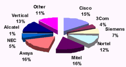 前面的一些統(tǒng)計(jì)數(shù)據(jù)是針對(duì)TDM PBX來說的,那么敏迪在IP-PBX的表現(xiàn)如何呢?敏迪自從2001年推出第一臺(tái)IP-PBX--3300 ICP起,在IP-PBX市場(chǎng)占有率節(jié)節(jié)攀升,2004年第二季度在美國的發(fā)貨量已經(jīng)與Avaya并列第一位(見右圖,來自Infotech,2004八月)。根據(jù)Synergy Research Group (SRG) 的題目為"2005年第二季度的企業(yè)語音市場(chǎng)占有率"的研究報(bào)告,敏迪的銷售以季度20%的增長(zhǎng)率持續(xù)增長(zhǎng),增長(zhǎng)率超過 Avaya,思科和北電在上一個(gè)季度的增長(zhǎng)率,鞏固了在中小型商業(yè)用戶市場(chǎng)的占有率排名第一的地位,并超過了在此領(lǐng)域的4個(gè)主要競(jìng)爭(zhēng)對(duì)手(3Com,Shoretel, Sphere和Vertical)占有率的總和。最近出版的Infonetics關(guān)于"2005年第二季度企業(yè)級(jí)IP-PBX全球市場(chǎng)分析和預(yù)測(cè)"的報(bào)告中將敏迪列為該季度世界上第二大IP-PBX供應(yīng)商,發(fā)貨量占21%,僅排在阿爾卡特之后,位列Avaya和北電之前,比去年同期增長(zhǎng)了2個(gè)百分點(diǎn)。