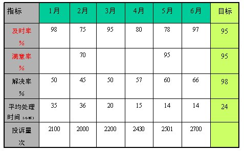 及時率:雖然在6月達(dá)到了97%,高于目標(biāo)值95%,但從1-6月份波動的情況來看,其表現(xiàn)為大幅波動,我們認(rèn)為此指標(biāo)處理失控狀態(tài),是沒有管理的或管理是無效的,必須加強(qiáng)管理;