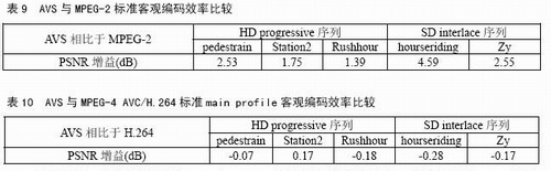對(duì)視頻編碼標(biāo)準(zhǔn)進(jìn)行客觀評(píng)價(jià)的常用方法是峰值信噪比PSNR。表9、表10分別給出了AVS與MPEG-2標(biāo)準(zhǔn)以及AVS與MPEG-4 AVC/H.264標(biāo)準(zhǔn)main profile的客觀編碼性能。結(jié)果為相同碼率條件下峰值信噪比PSNR的增益?梢钥闯,AVS相對(duì)于MPEG-2標(biāo)準(zhǔn)編碼效率平均提高2.56dB,相比于H.264標(biāo)準(zhǔn)編碼效率略低,平均有0.11dB的損失。