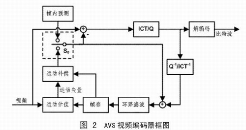 AVS視頻標(biāo)準(zhǔn)定義了I幀、P幀和B幀三種不同類型的圖像,I幀中的宏塊只進(jìn)行幀內(nèi)預(yù)測(cè),P幀和B幀的宏塊則需要進(jìn)行幀內(nèi)預(yù)測(cè)或幀間預(yù)測(cè),圖中S0是預(yù)測(cè)模式選擇開關(guān)。預(yù)測(cè)殘差進(jìn)行8×8整數(shù)變換(ICT)和量化,然后對(duì)量化系數(shù)進(jìn)行zig-zag掃描(隔行編碼塊使用另一種掃描方式),得到一維排列的量化系數(shù),最后對(duì)量化系數(shù)進(jìn)行熵編碼。AVS視頻標(biāo)準(zhǔn)的變換和量化只需要加減法和移位操作,用16位精度即可完成。