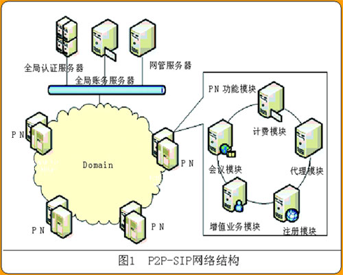 PN在地理上散布各處,邏輯上根據(jù)選用的P2P機(jī)制的不同可以是環(huán)形的(Chord協(xié)議)、矩陣的(CAN協(xié)議)、網(wǎng)狀的(Pastry協(xié)議和Tapestry協(xié)議)。基本的PN至少包括注冊(cè)和代理兩種功能。為進(jìn)行商業(yè)運(yùn)營,可以部署全局認(rèn)證服務(wù)器、全局賬務(wù)服務(wù)器和網(wǎng)管服務(wù)器等等,用于管理全部的用戶和所有的PN。