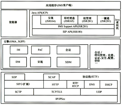 在此首先分析包括IETF、3GPP、OMA和JCP在內(nèi)的標準組織與IMS客戶端相關(guān)的規(guī)范,然后基于這些研究,給出了IMS客戶端的軟件架構(gòu)參考設(shè)計圖。