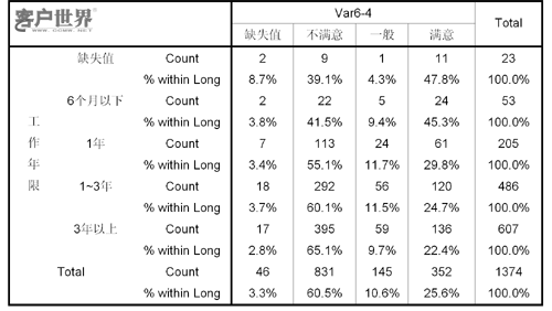 我們使用SPSS進行交叉分析后,得到了不同層次的座席代表滿意度數(shù)據(jù),例如: