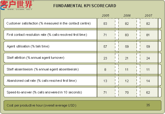 呼叫中心理論、實(shí)踐和投資三者相結(jié)合就會(huì)實(shí)現(xiàn)生產(chǎn)效率、生產(chǎn)效能、生產(chǎn)力和銷(xiāo)售業(yè)績(jī)的結(jié)合。2007計(jì)分卡顯示客戶滿意度得分很低。我們認(rèn)為呼叫中心必須采取一種正確的方式來(lái)理解此項(xiàng)活動(dòng)的真正的價(jià)值,以便更準(zhǔn)確地估測(cè)和報(bào)道客戶滿意度。