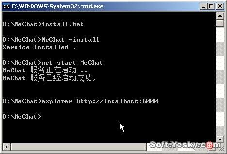 說(shuō)明:MeChat目錄中還有一個(gè)Run、bat,該文件用于測(cè)試MeChat服務(wù)器。假如安裝MeChat時(shí)Run、bat的命令窗口還開(kāi)著,則務(wù)必先關(guān)閉此窗口再執(zhí)行install、bat。另外,雙擊執(zhí)行該目錄下的uninstall、bat批處理文件可以停止并刪除系統(tǒng)中的MeChat服務(wù)。