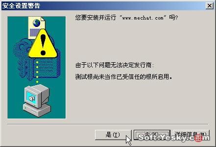 初次進(jìn)入MeChat聊天室,瀏覽器會(huì)彈出如圖25所示的安全設(shè)置警告,單擊“是”,然后程序會(huì)自動(dòng)下載安裝MeChat語(yǔ)音與視頻聊天插件。