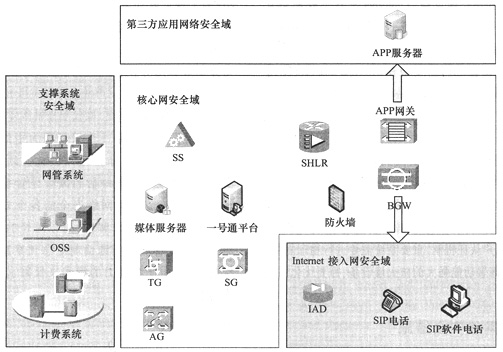 核心網(wǎng)安全域包括所有的軟交換機(jī),TG、AG、SG等接入網(wǎng)關(guān),BGW類(lèi)設(shè)備,關(guān)鍵業(yè)務(wù)平臺(tái)(包括SHLR、號(hào)碼轉(zhuǎn)換平臺(tái)等),軟交換媒體服務(wù)器和應(yīng)用服務(wù)器,開(kāi)發(fā)給第三方業(yè)務(wù)接口的應(yīng)用網(wǎng)關(guān)。Internet接入網(wǎng)安全域包括所有分配公網(wǎng)地址的SIP電話(huà)終端、IAD類(lèi)設(shè)備、各類(lèi)SIP接入的PC等。支撐系統(tǒng)安全域包括網(wǎng)管、計(jì)費(fèi)和OSS等輔助運(yùn)營(yíng)系統(tǒng)。第三方應(yīng)用網(wǎng)絡(luò)安全域主要包括所有以開(kāi)發(fā)業(yè)務(wù)接口方式接入的應(yīng)用服務(wù)器,鑒于目前實(shí)際應(yīng)用中很少涉及到這種應(yīng)用,這里不討論該區(qū)域的安全需求。