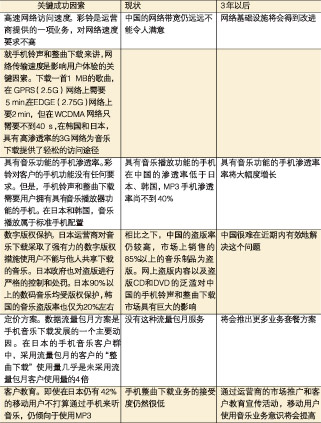 無(wú)線音樂(lè)市場(chǎng)的現(xiàn)狀、3年以后的情況以及成功的關(guān)鍵因素歸納總結(jié)見(jiàn)表2。