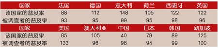 調(diào)查結(jié)果顯示,超過50%的受訪者會在家里使用手機打電話,在中國和韓國,這一比例甚至高達90%。在家使用手機上網(wǎng)的情況剛好相反,大部分的被調(diào)查者表示他們不會在家使用手機上網(wǎng),相比之下,中國和日本用手機在家上網(wǎng)的人數(shù)較其它國家多一些。